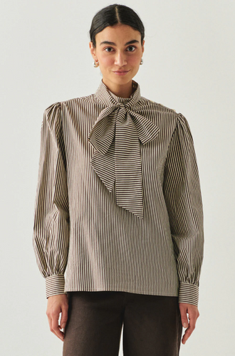Exquise -Indigo Brown-Bone Striped Cotton Blouse with High Neck, Tie Detail, and Long Sleeves