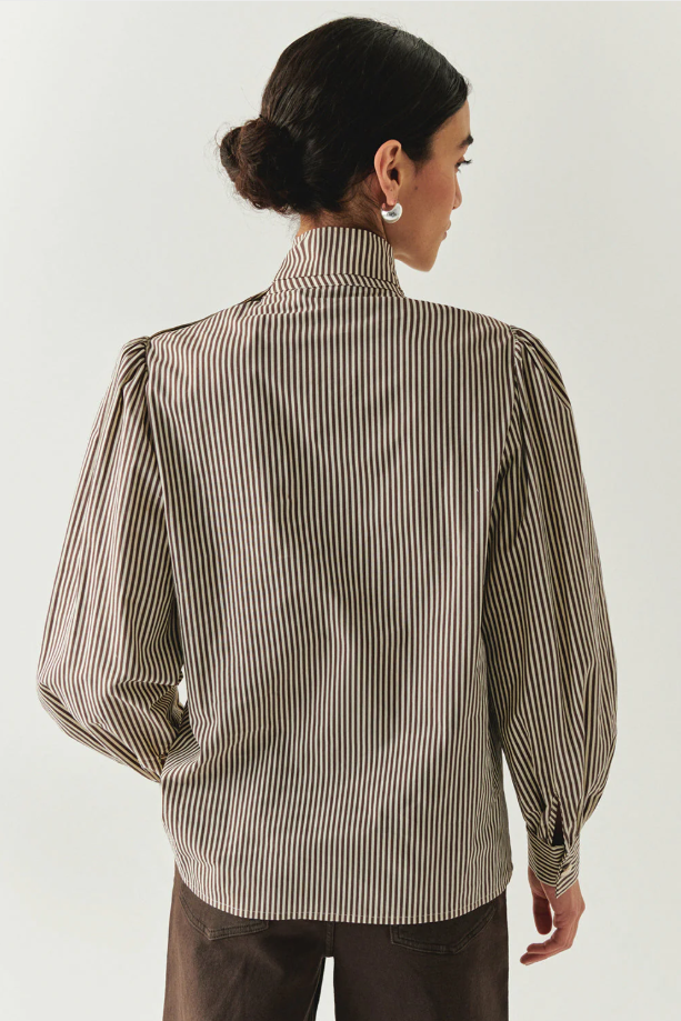 Exquise -Indigo Brown-Bone Striped Cotton Blouse with High Neck, Tie Detail, and Long Sleeves