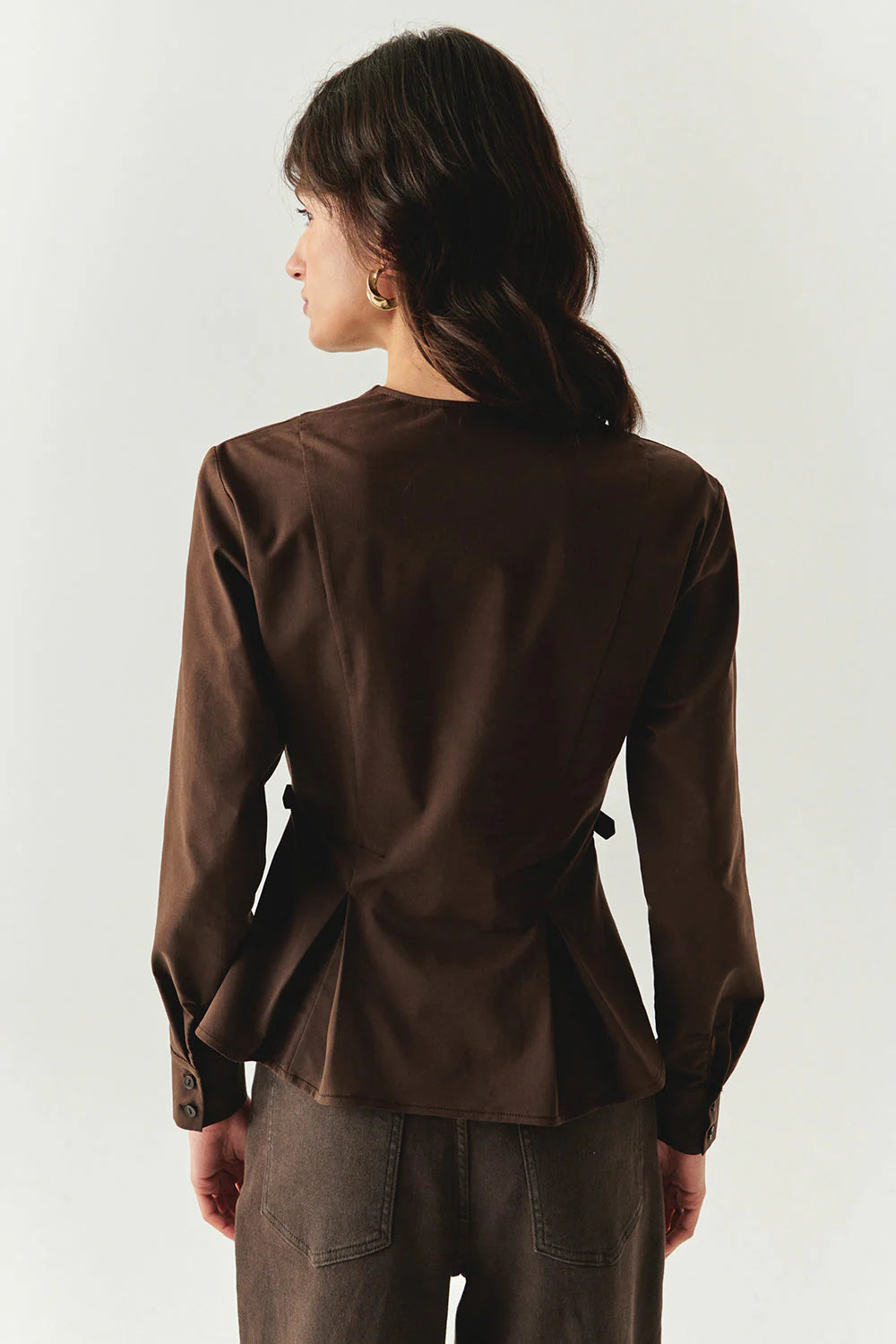 With a flattering wrap-style front and structured notched lapels, the Ashlynn Shirt in black redefines everyday sophistication. Designed in a stretch cotton blend, it subtly nips in at the waist with buckle accents for added shape.