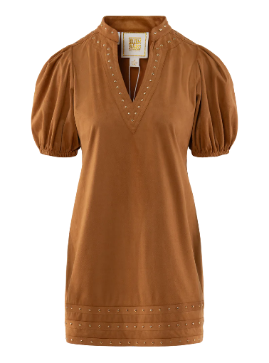 The Hampton Mini in Brown Sugar Suede is a standout take on one of our most beloved silhouettes. Designed with a mandarin collar, V-neckline, and puff sleeves, this dress balances structure with ease. Crafted in plush brown sugar suede, the fabric’s rich texture makes it an ideal choice for the season. Gold studded details trace the neckline and continue across the hemline, giving this classic style a refreshed, modern edge. The mini length adds versatility, making it perfect to wear on its own or layered with boots and outerwear as the weather shifts.