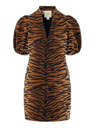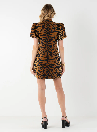 The Hampton Mini in Tiger Jacquard brings bold texture and refined tailoring together in a versatile statement piece. Featuring a mandarin-style collar, voluminous puff sleeves, and a tailored silhouette, this dress is finished with side pockets and intricate stitching for added detail. The rich, textural jacquard elevates the classic tiger motif, making it a standout style for the season.